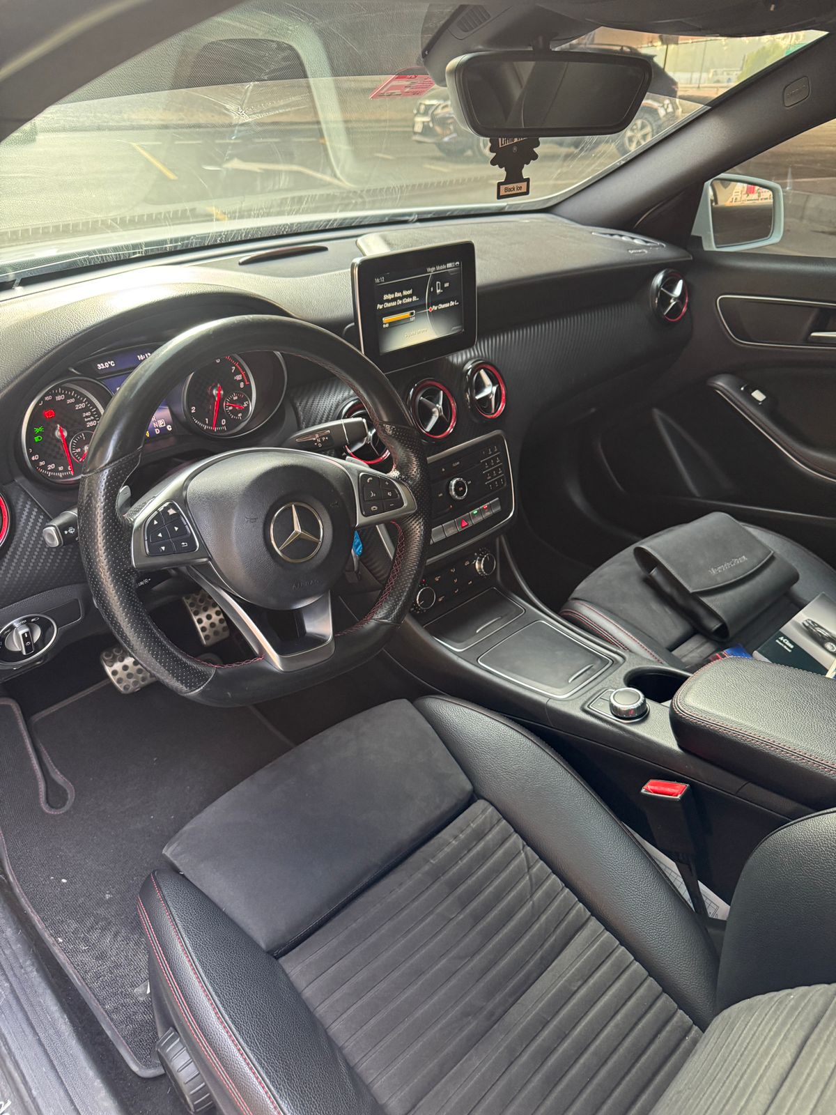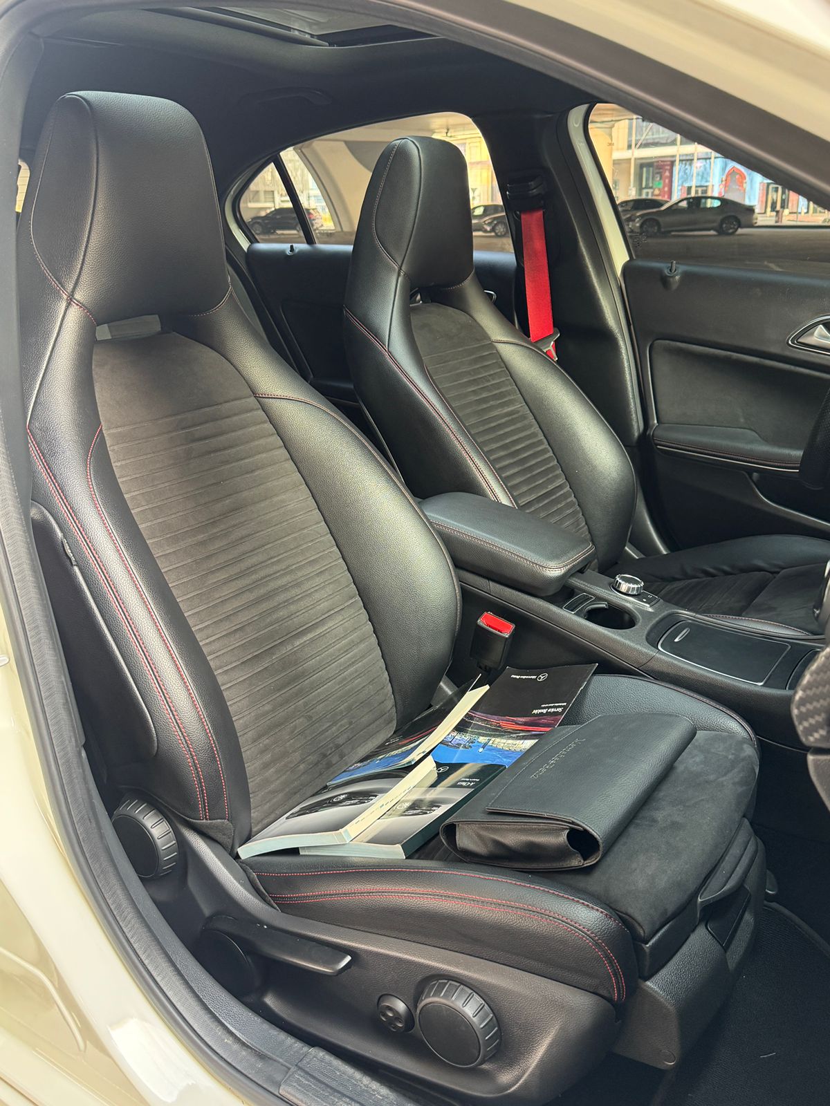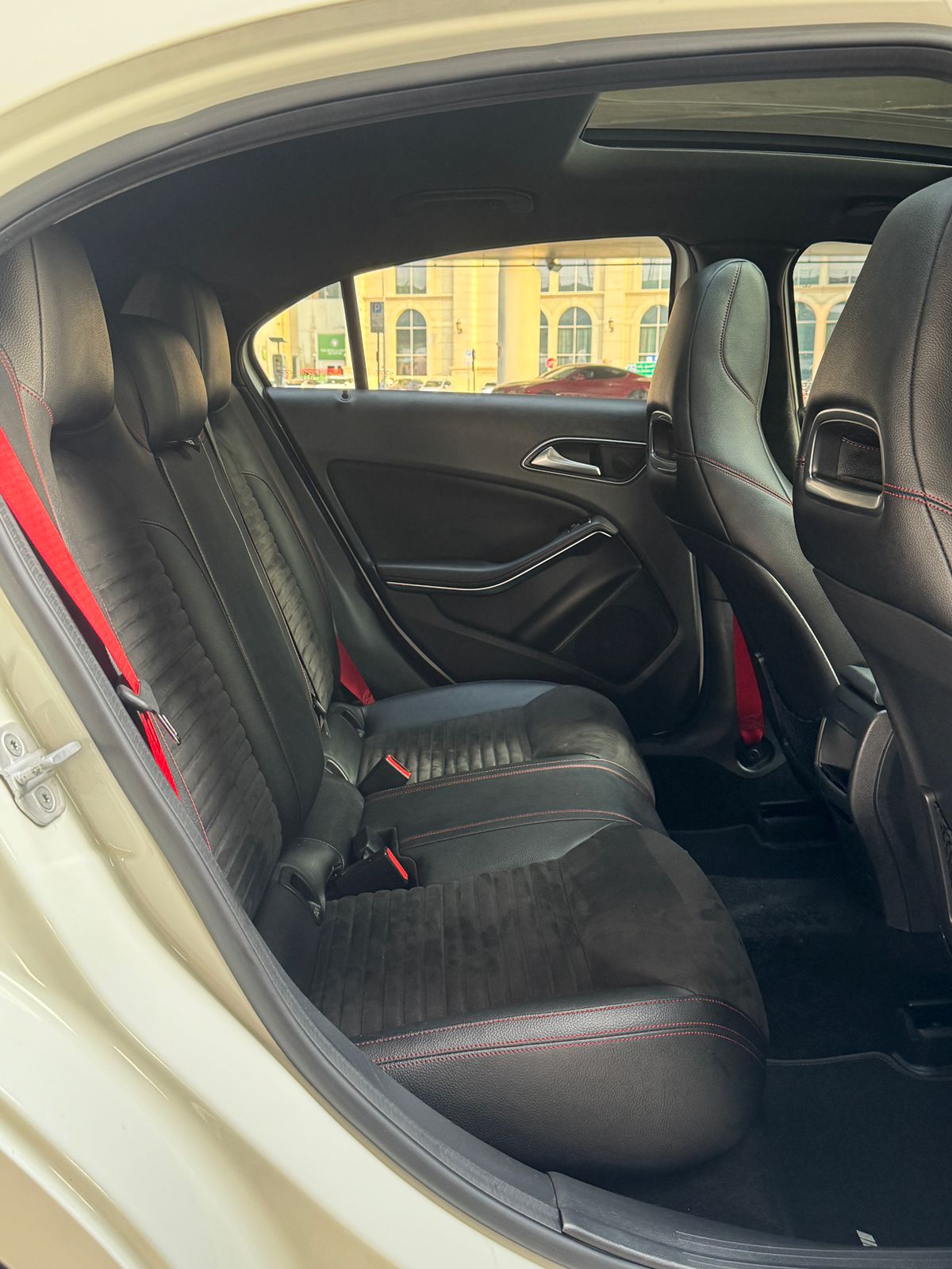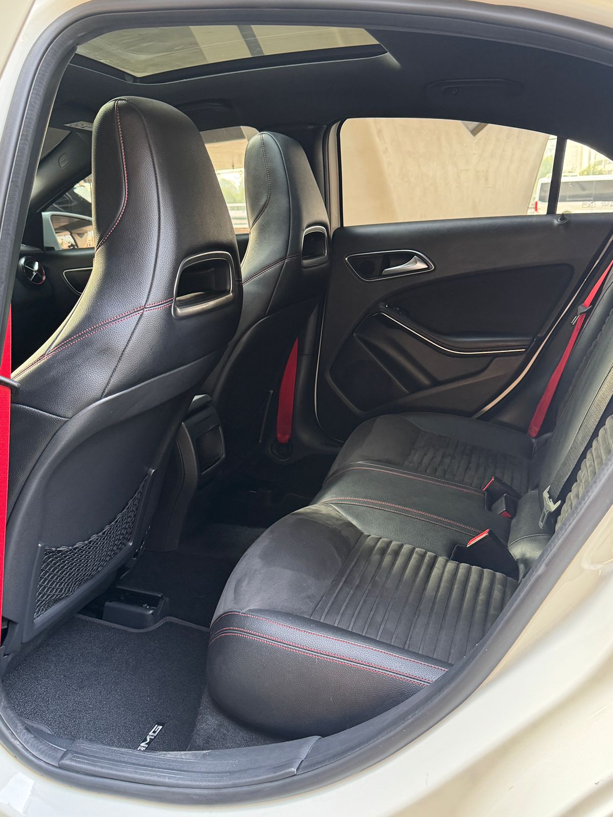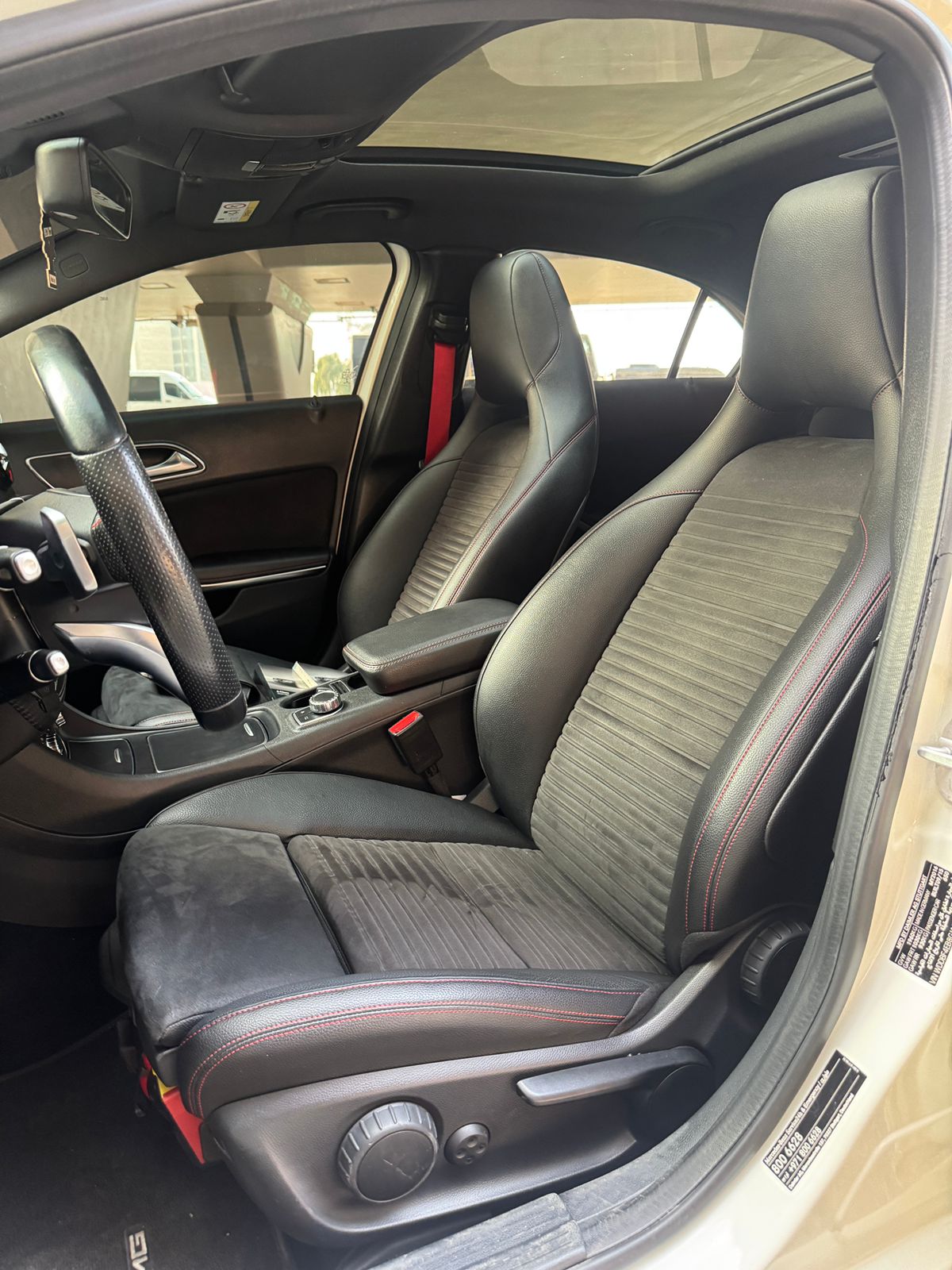 Inside, you get a suede leather interior with red stitching and red seatbelts, AMG mats, paddle shifters, and a long sunroof, all the right sporty touches.